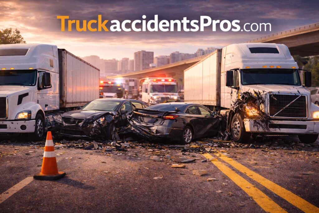 Trailer movement adds further risk. Jackknife and rollover events shift direction rapidly. Vehicles alongside or behind the truck become trapped. Secondary impacts multiply injury potential across multiple contact points.